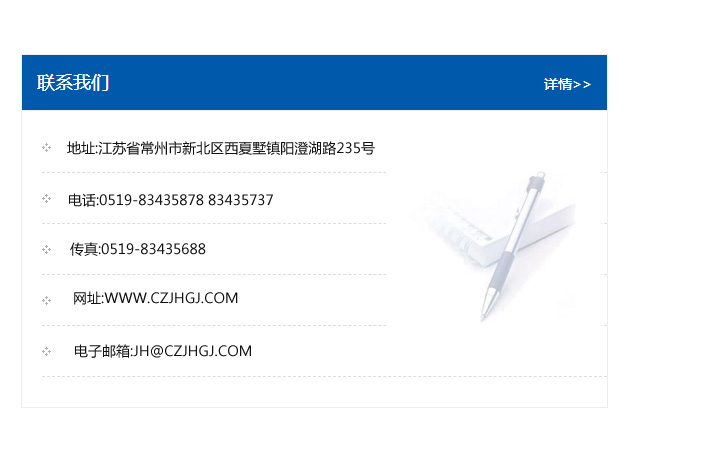 傳真:0519-83435688    郵編:213135    網址:WWW.czjhgj_com.hnjajx.com    電子郵箱:JH@czjhgj_com.hnjajx.com